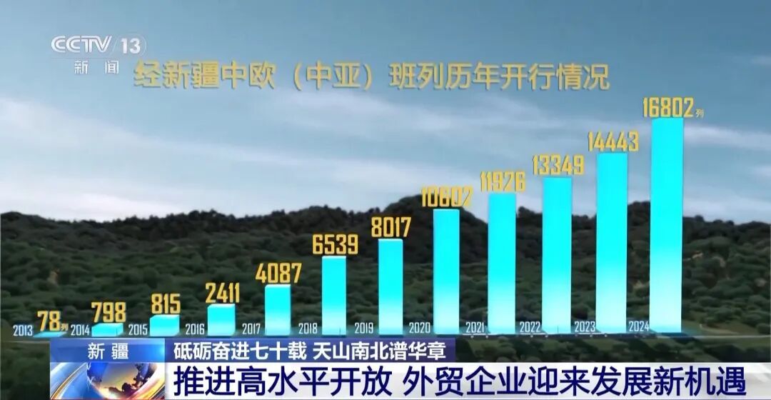 铁路通行能力持续加大,中欧中亚班列通行量由2013年的78列,增长到2024年的1.68万列。