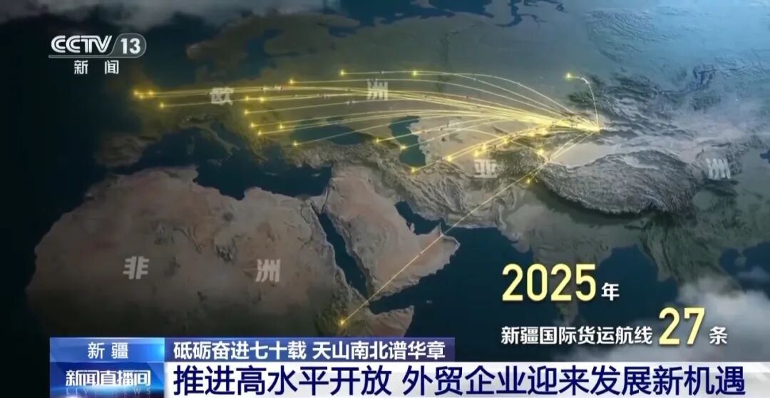 空中航线密集上新,新疆国际货运航线数量从2012年的4条增至27条,联通亚非欧三大洲。