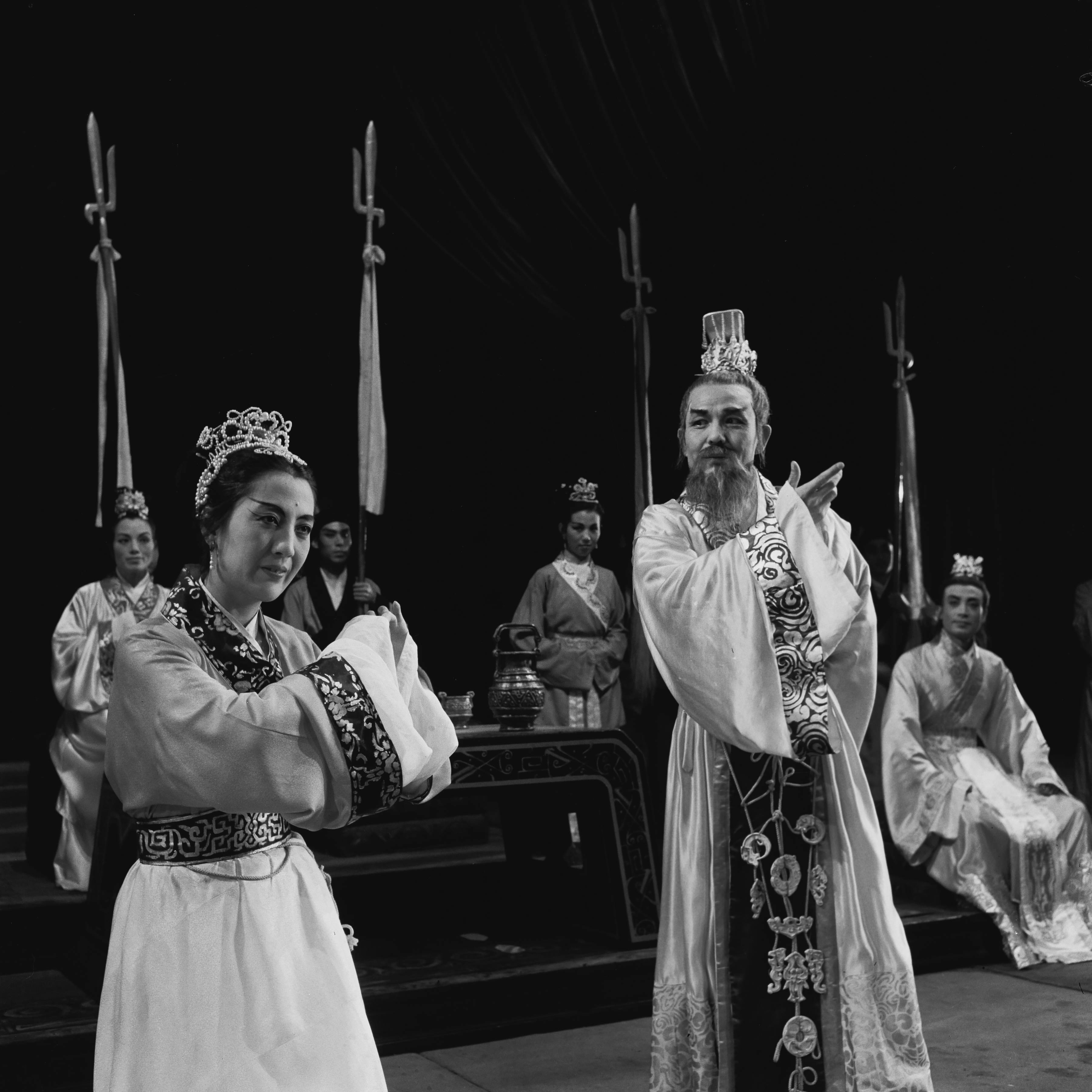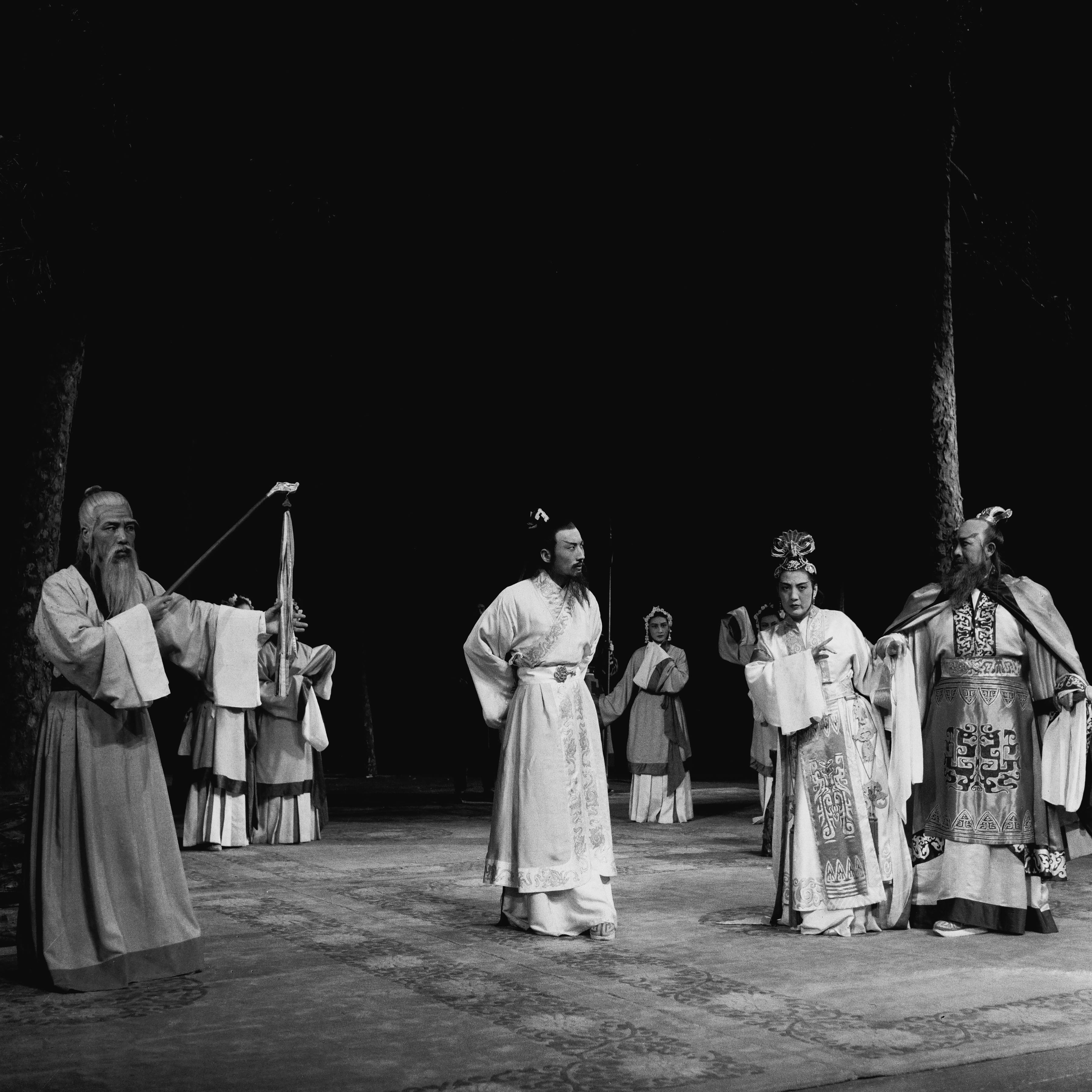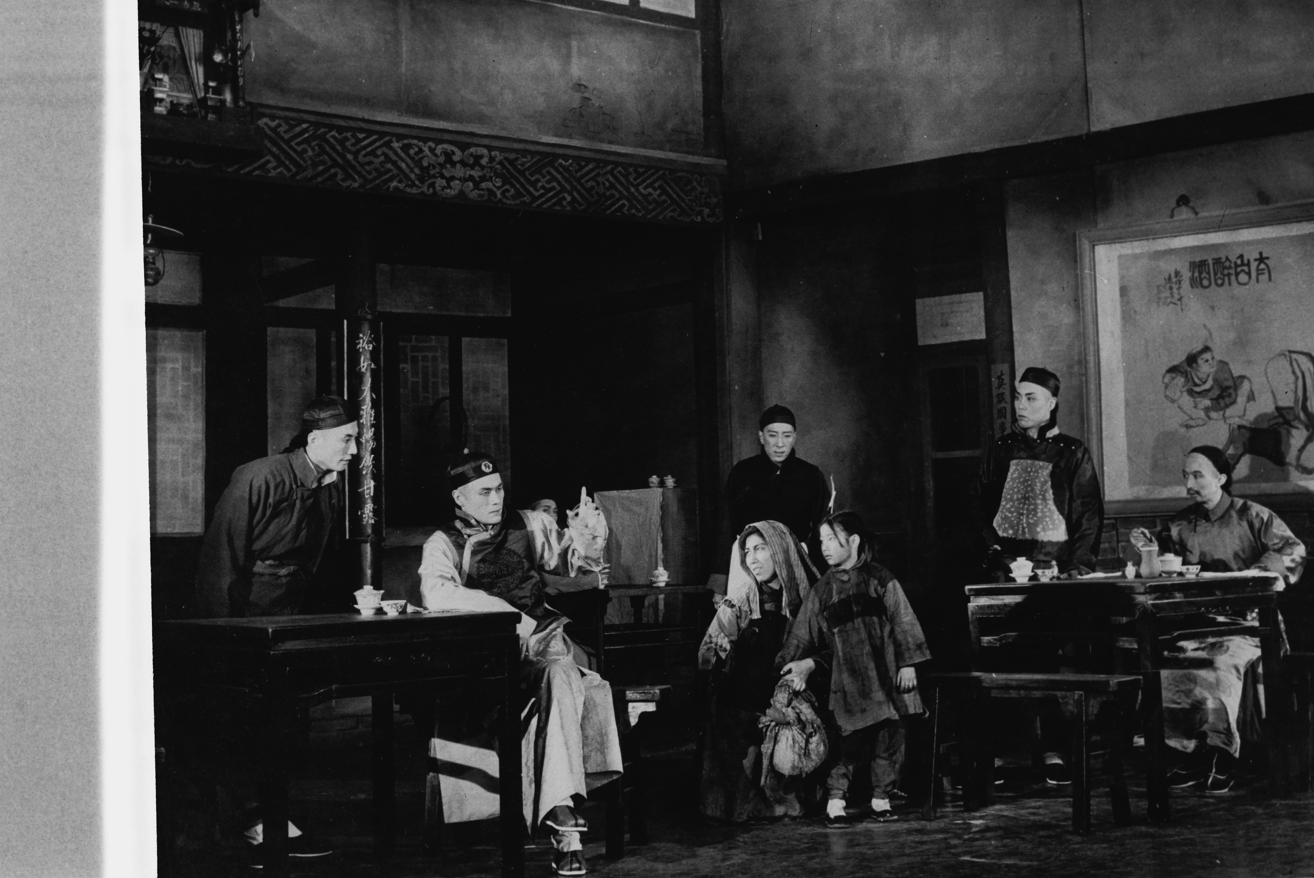 焦菊隐导演话剧《茶馆》1958年3月在首都剧场首演剧照。(北京人艺供图)事实上,焦菊隐在北京人艺第一次有意识地进行话剧民族化的尝试,是1957年初首演的《虎符》。剧中,他结合写实和写意风格,并借鉴戏曲的一些表演方法。