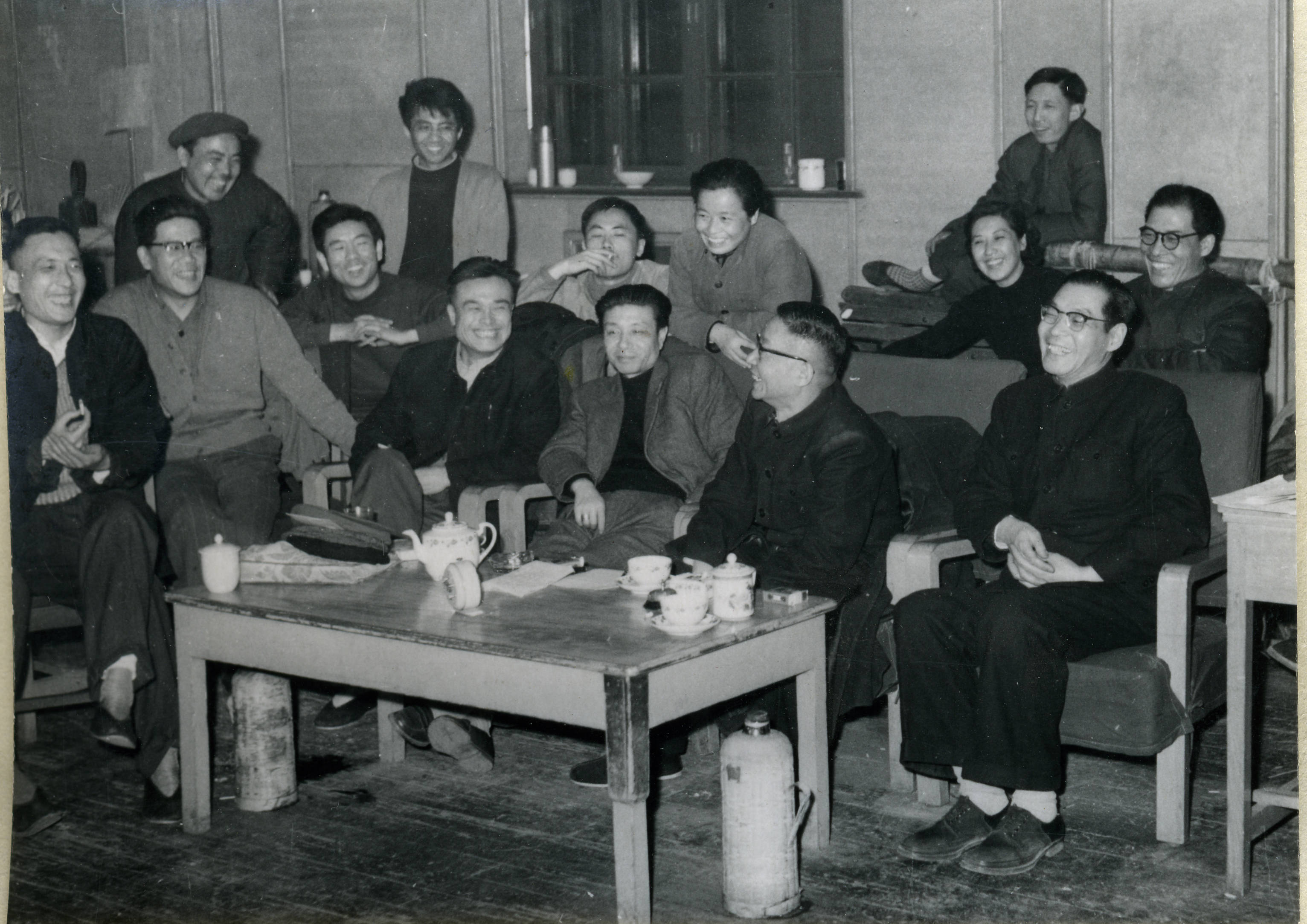 1963年4月,《茶馆》再次演出前,导演焦菊隐(前排右一)和编剧老舍(前排右二)与剧组成员在排练场聚谈。(北京人艺供图)走出中国气派的戏剧之路