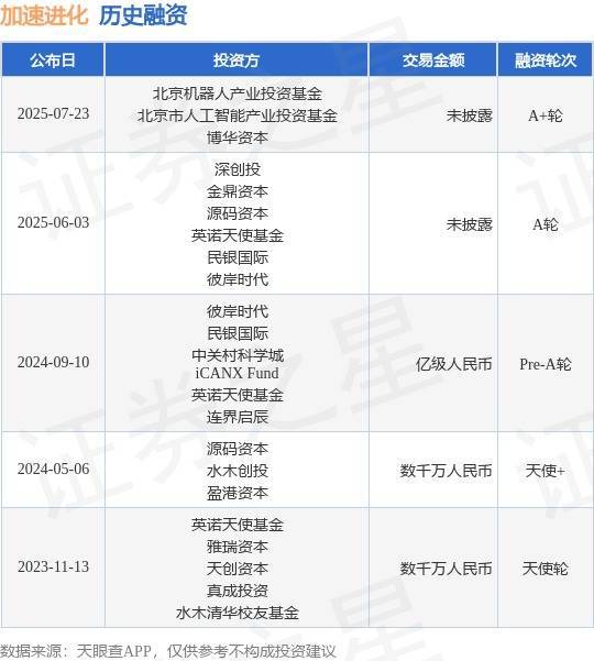 证券之星消息,根据天眼查APP于7月23日公布的信息整理,北京加速进化科技有限公司A+轮融资,融资额未披露,参与投资的机构包括北京机器人产业投资基金,北京市人工智能产业投资基金,博华资本。